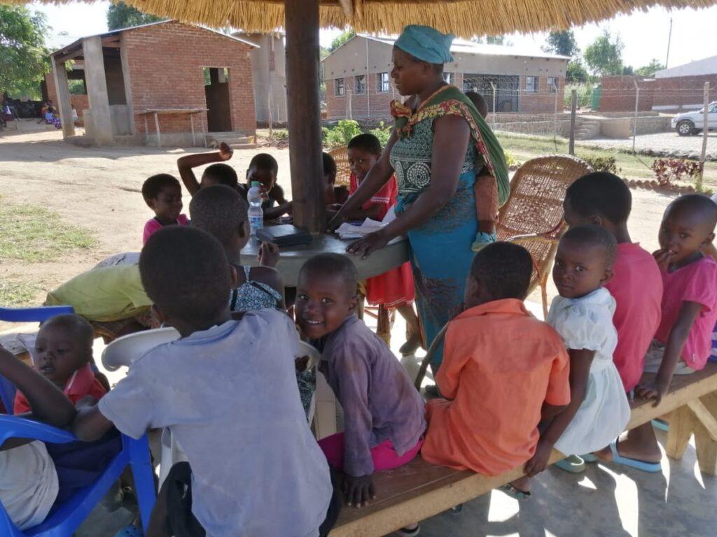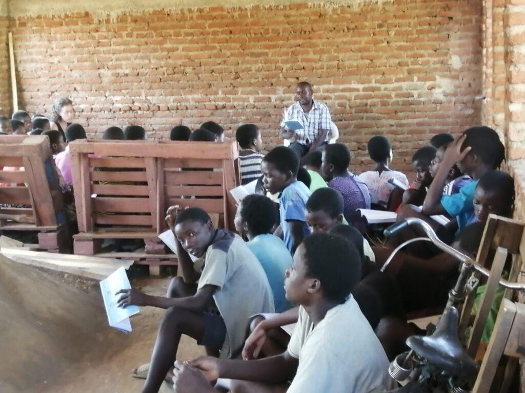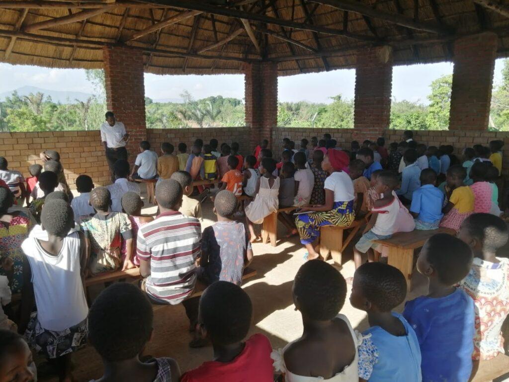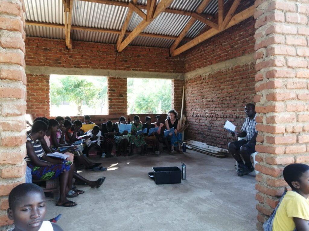 Since the MGO day camp in August, the number of children and youth attending has been continued to increase. They now meet as three separate age groups. As you can see from the photos below, one group meets in the msasa (thatch gazebo), while another smaller group meets under a smaller gazebo.The remaining group is meeting in the block-making shed (you can just see the mound of gravel) for lack of space elsewhere.